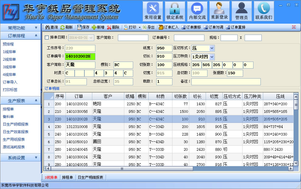 生产报表:排程单——对应每天的排产记录;备料单——对应排产的记录进行纸质的归类统计,供抱车司机进行领料查看;